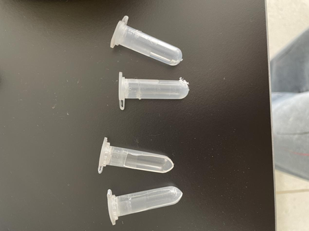 實驗開始客戶使用自配的離心管進行研磨,兩個樣品,另外添加兩個凈信生產的加厚研磨管進行四角配平,時間30s,功率調到4檔。客戶的離心管很薄,立馬被擊碎,凈信加厚研磨管沒有破裂但也出現了較嚴重磨損。