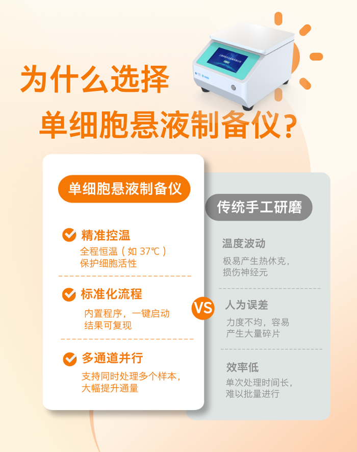 背景介紹:在神經(jīng)科學(xué)研究中,小鼠腦組織的解離一直是一道“硬骨頭”。傳統(tǒng)的手工研磨不僅耗時(shí)費(fèi)力,更常因機(jī)械剪切力過大或溫度控制不均,導(dǎo)致細(xì)胞受損、活率低下。今天,我們分享一款儀器——單細(xì)胞懸液制備儀,讓您的實(shí)驗(yàn)數(shù)據(jù)大大提升。