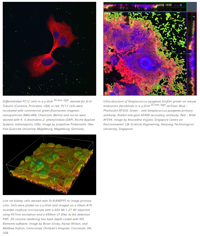 The μ-Dish 35 mm, high comes with a thin ibidi Polymer Coverslip Bottom that has the highest optical quality (comparable to glass) and is ideally suitable for high-resolution microscopy. It is also available with a #1.5H Glass Coverslip Bottom for TIRF or single molecule microscopy.