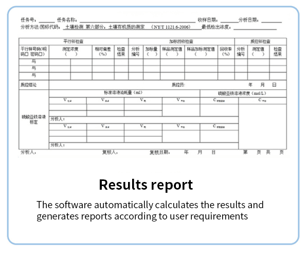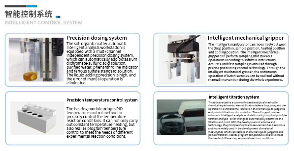 The automatic intelligent analysis workstation for soil organic matter is identified by a manipulator, grabs and moves the sample cup; accurately controls the temperature change during the micro-boiling process of the sample; in the titration process, through the principle of bionic color titration, it can accurately identify the color mutation of the titration end point; the software automatically passes the organic matter automatic Calculate the results and generate reports, and save the results to the database.