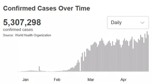 根據世衛組織新實時統計數據,截至北京時間5月26日0時42分,全球累計新冠肺炎確診病例5307298例,死亡病例342070例。
