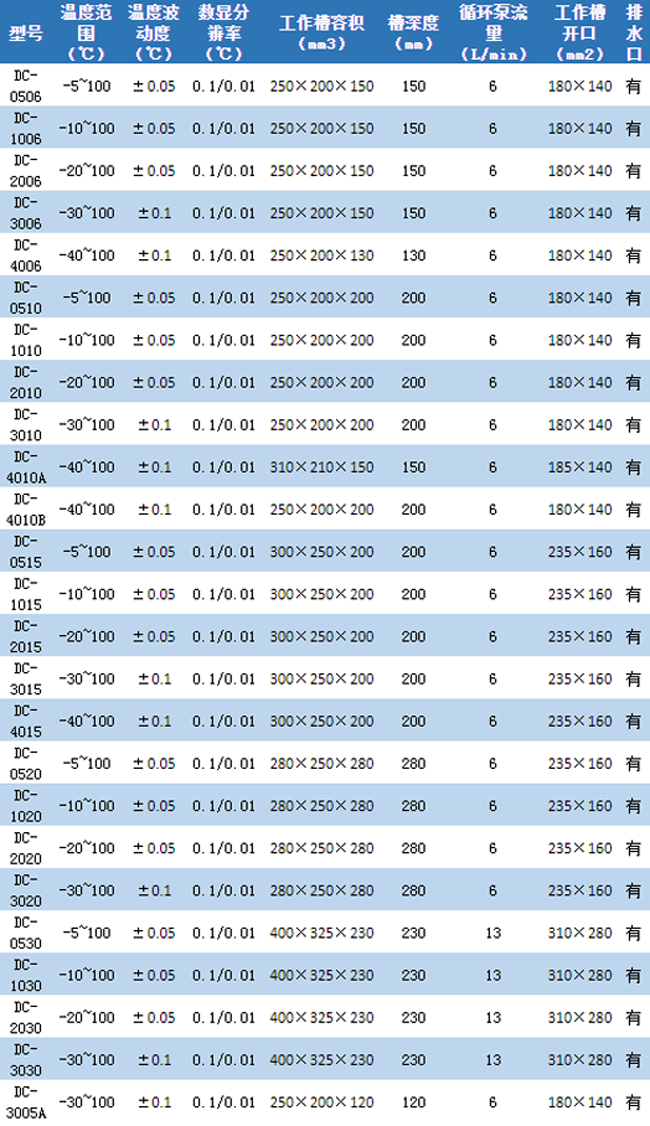 DC低溫恒溫槽系列型號(hào)與參數(shù)對(duì)照表1: