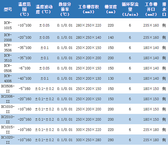 DC低溫恒溫槽系列型號(hào)與參數(shù)對(duì)照表2: