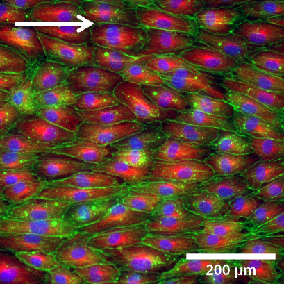 HUVEC在I型膠原蛋白(2 mg / ml)上以10 dyn /cm2的流量培養5天后的熒光顯微鏡檢查 。