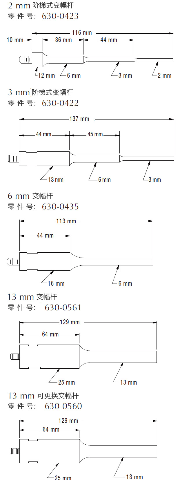 注:所有探頭和可更換探頭均由高等級鈦合金Ti-6Al-4V制成,可高壓滅菌。由于超聲波探頭調試到共振狀態,其長度可能會因鈦合金的彈性模量變化而略有變化。