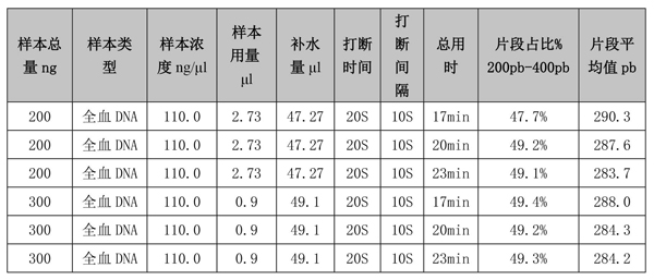 在投入量分別是200ng時,通過Qsep100片段分析儀檢測,打斷的DNA片段在200-400bp區(qū)間占比分別是