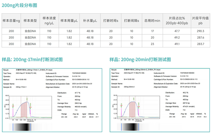 現(xiàn)針對提取的一管全血DNA樣本,投入量分別是200ng加入到0.2ml離心管中,具體實驗條件及打斷后的片段分布圖如下:
